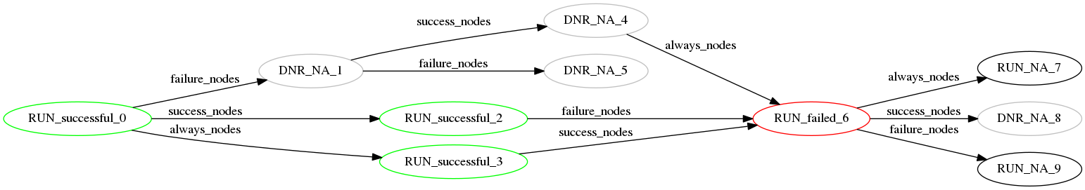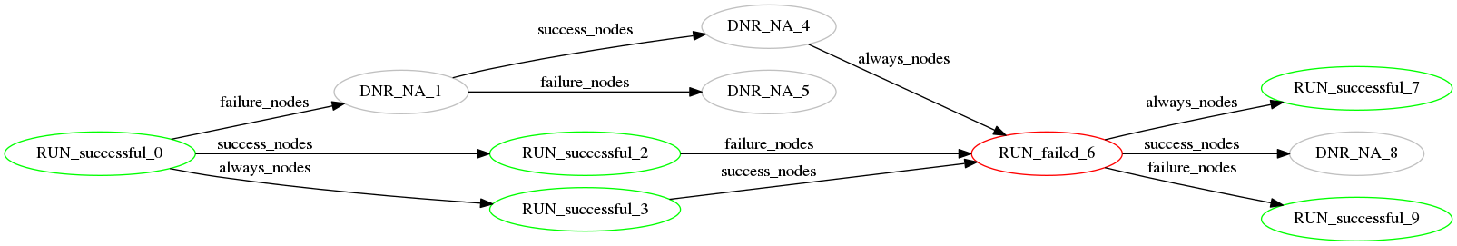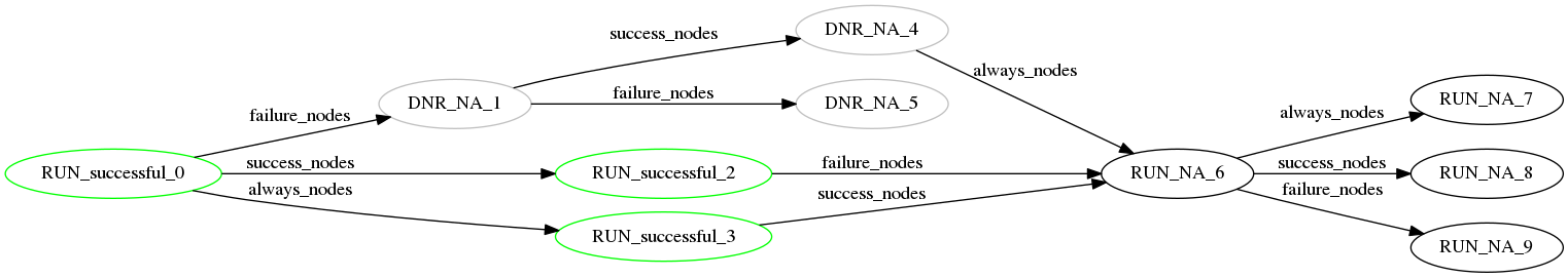 Root nodes are selected to run. A root node is a node with no incoming nodes. Node 0 is selected to run and results in a status of `'successful'`. Nodes 1, 4, and 5 are marked `'DNR'` because they are in the failure path. Node 6 is not marked `'DNR'` because nodes 2 and 3 may run and result and node 6 running. The same reasoning is why nodes 7, 8, 9 are not marked `'DNR'`.